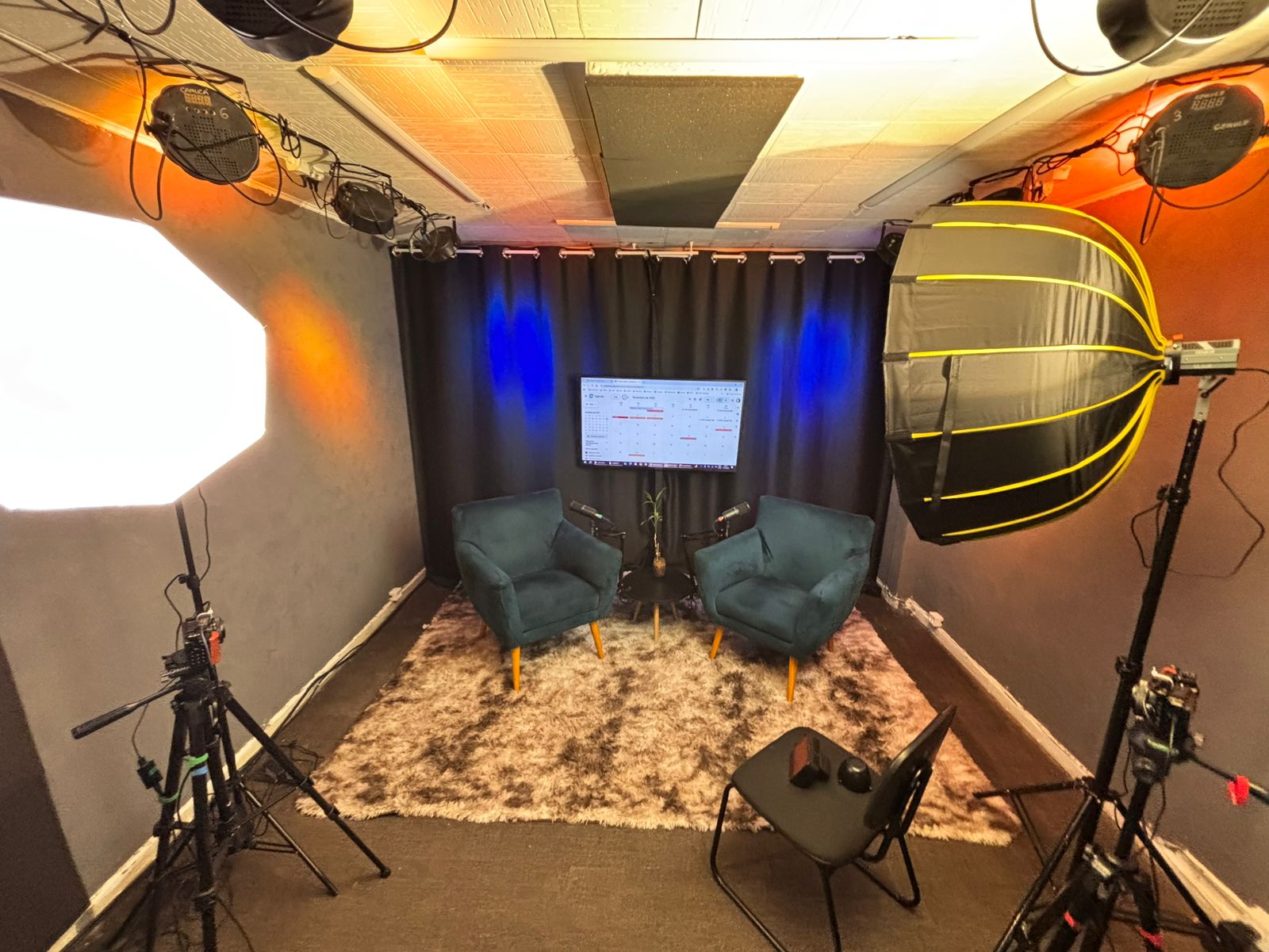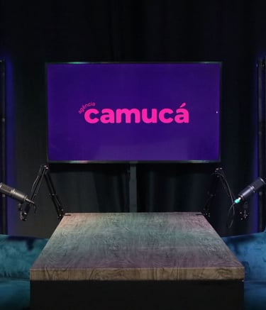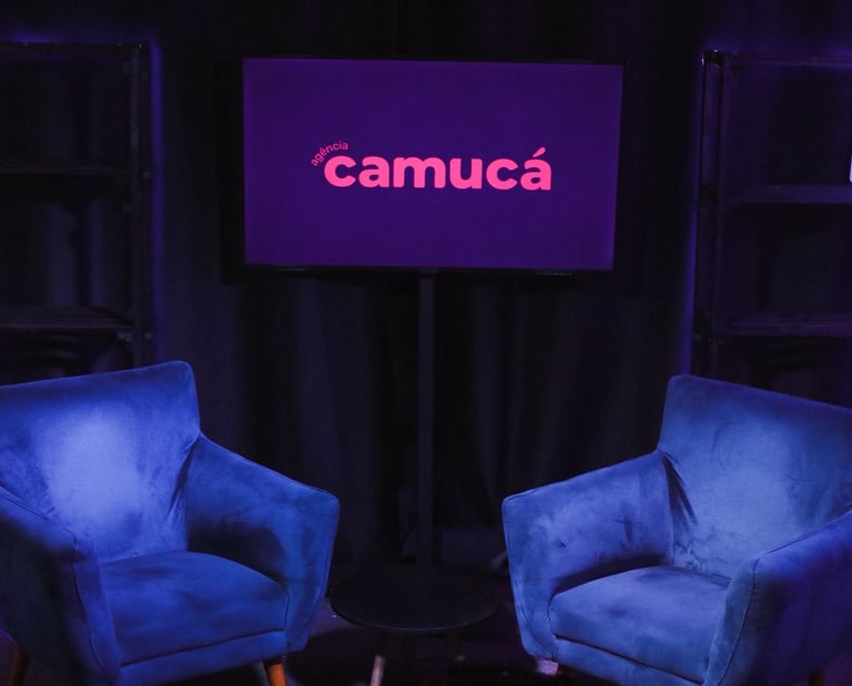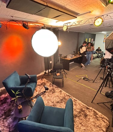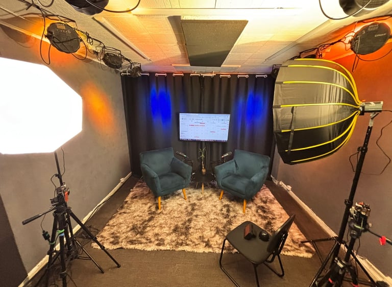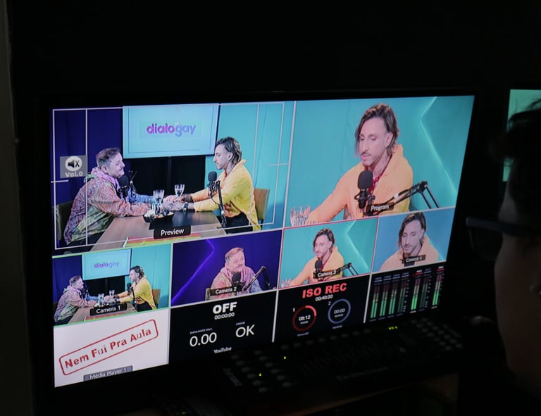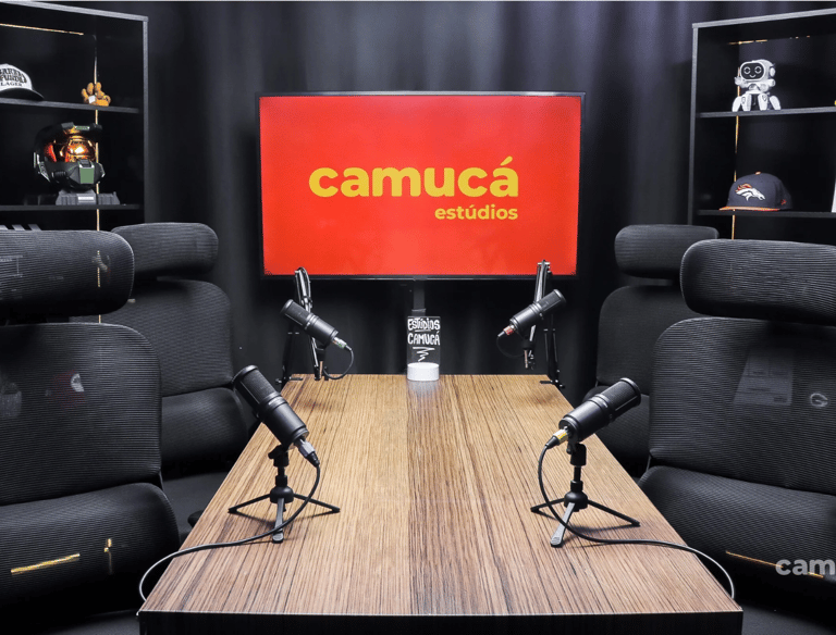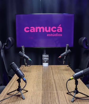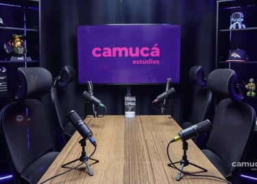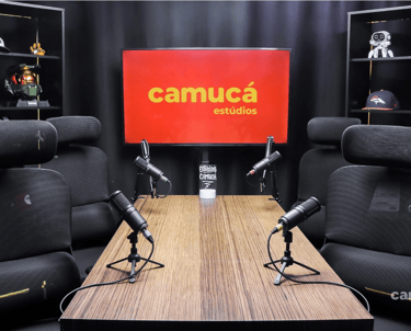 Estúdio no centro de São Paulo preparado para gravação de podcasts, talk shows e conteúdo em vídeo.
