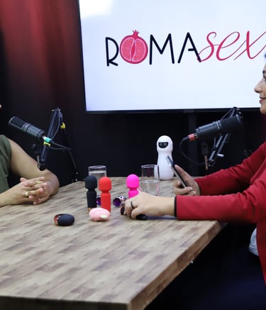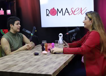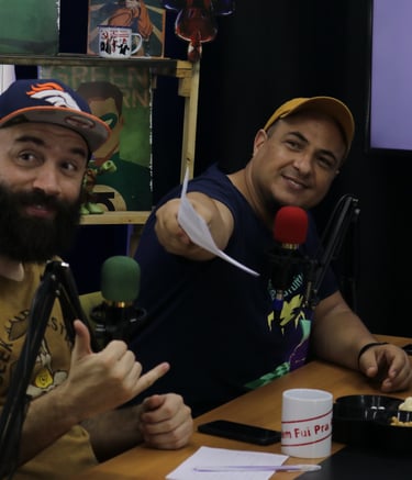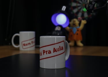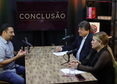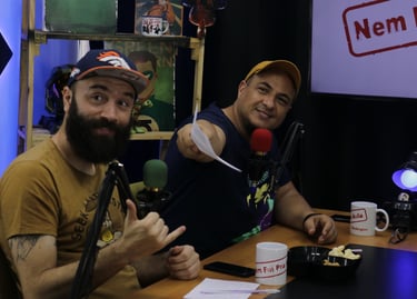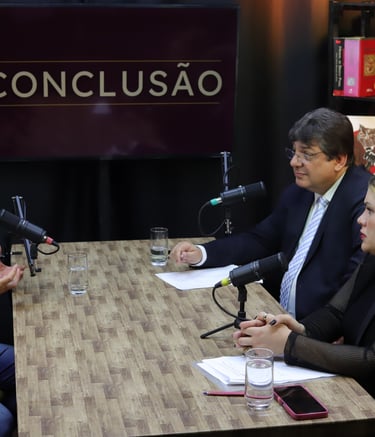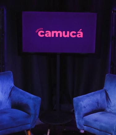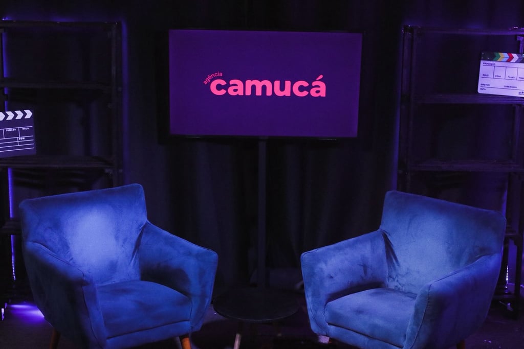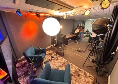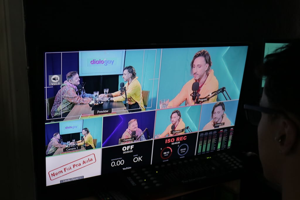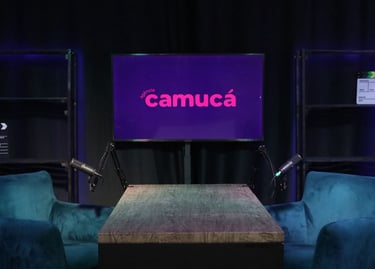 Estúdio no centro de São Paulo preparado para gravação de podcasts, talk shows e conteúdo em vídeo.